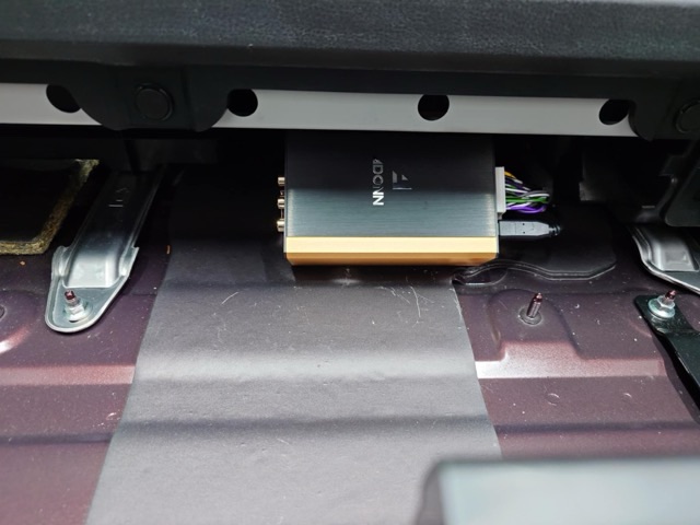 メインユニットからフロントスピーカー出力ラインを引いてアンプ内蔵DSPに入力して、アンプ内蔵DSPからフロントスピーカーとリアスピーカーに出力しています。