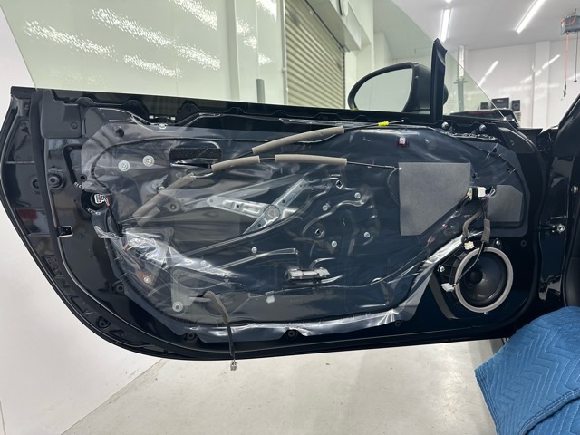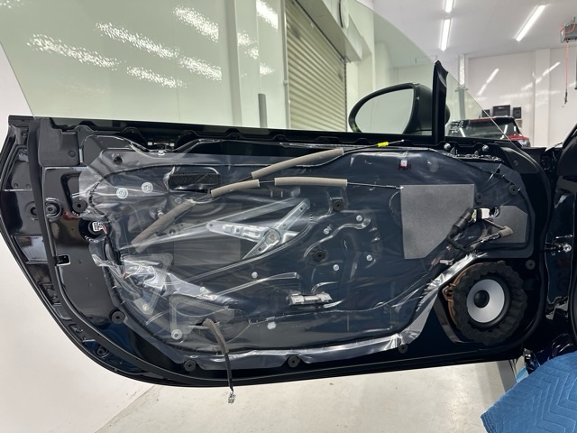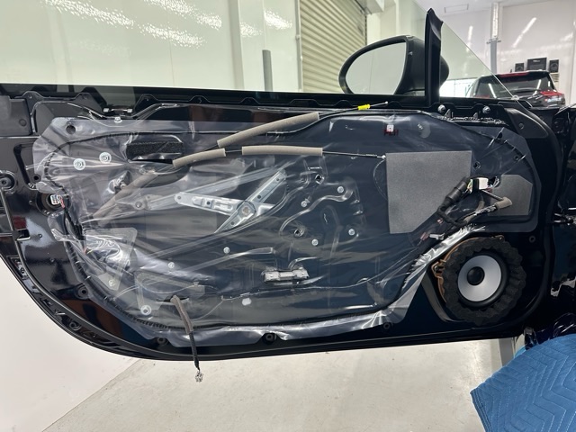 ドアトリム内部に音が回り込むのを防ぐaudio-technicaサウンドプルーフィングウェ―ブAT-AQ442を貼って