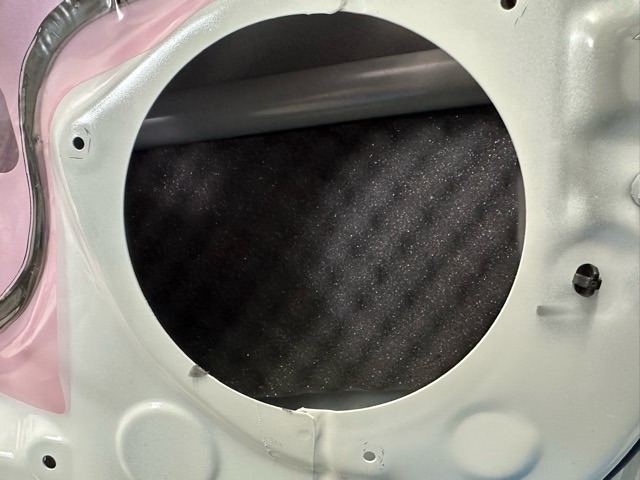 「当店オリジナル吸音セット」から、ドアトリムからの音漏れやガタつきを抑えるインナーパネル用防音材のサウンドプルーフィングウェーブをスピーカー外周に貼付けて