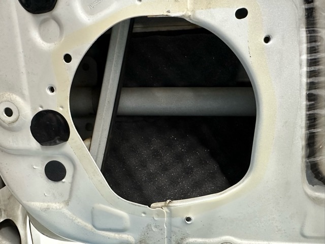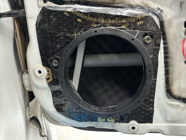 「当店オリジナル吸音セット」から、ドアトリムからの音漏れやガタつきを抑えるインナーパネル用防音材のサウンドプルーフィングウェーブをスピーカー外周に貼付けて