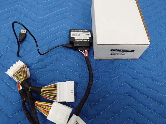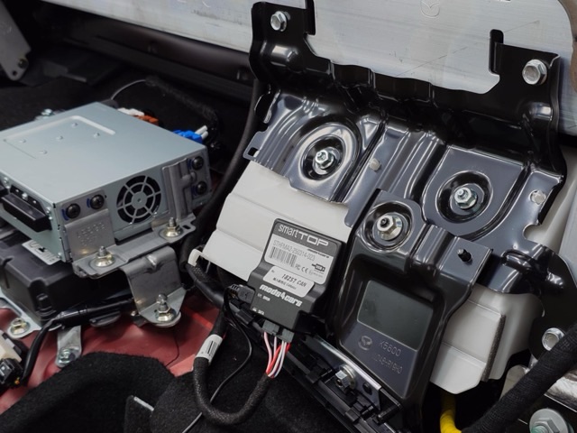 特に加工等も必要なくコネクターで割り込ませるだけなので、車両の助手席側背もたれの後ろのパネルを外して電動ルーフのユニットへアクセスしスマートトップ本体を取付!