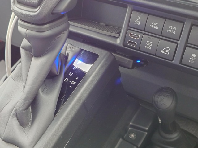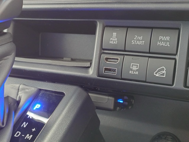 ETC2.0はわかりにくいですが、純正のETCを取り付ける位置と同じでシフトレバーの前側、先ほどご紹介したUSB/HDMIの下側に映っているブルーに光っているもの、これがETCです。