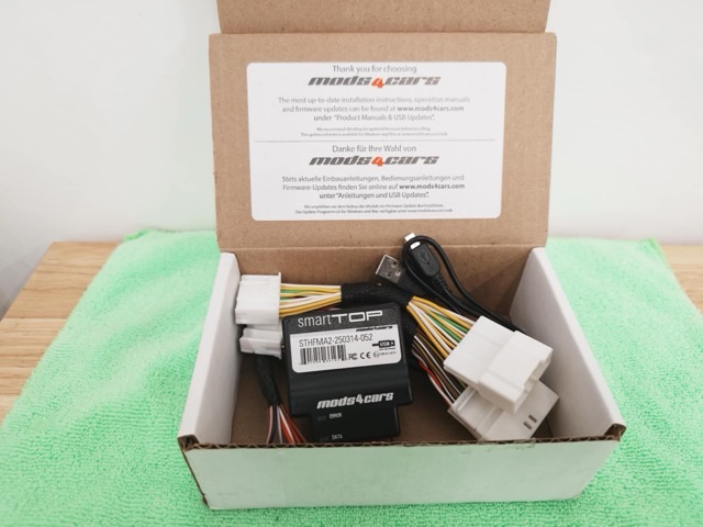 特に加工等も必要なくコネクターで割り込ませるだけなので、車両の助手席側背もたれの後ろのパネルを外して電動ルーフのユニットへアクセスしスマートトップ本体を取付!